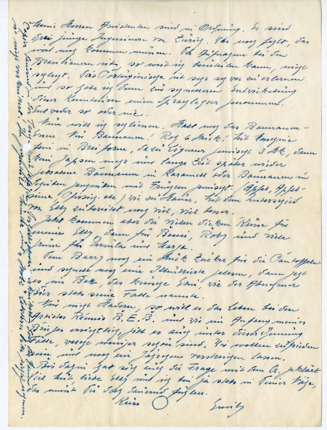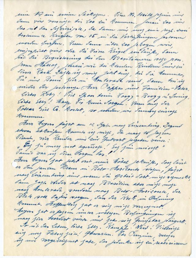 Herr Meyers hat jetzt erst seine Möbel gekauft, doch lässt er den ganzen Kram in Belo Horizonte stehen, fährt nach Luxemburg und wenn die Arbeit dort nicht schmeckt, dann geht's wieder ab nach Brasilien aber nicht mehr nach Monlevade, sondern nach Belo Horizonte, Der Blitz(?) soll dafür sorgen dass der Kretz(?) in Ordnung kommt. Hoffentlich hat er sich nicht verrechnet.