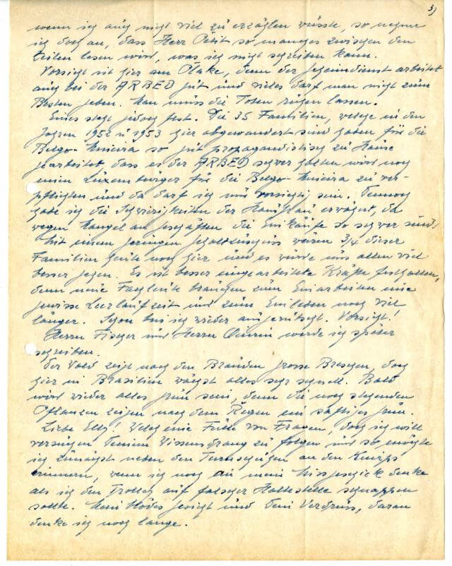 Eines steht jedoch fest. Die 35 Familien, welche in den Jahren 1952 und 1953 hier abgewandert sind haben für die Belgo Mineira so gut propagandistisch zu Hause gearbeitet, dass es der Arbed schwer fallen wird noch einen Luxemburger für die Belgo Minera zu verpflichten und da darf ich nur vorsichtig sein. Dennoch habe ich die Schwierigkeiten der Hausfrau erwähnt, da wegen Mangel an Geschäften die Einkäufe so schwer sind. Mit einem geringen Gehaltzuschuss wären 3/4 dieser Familien heute noch hier und es würde uns allen viel besser gehen. Es ist besser eingearbeitete Kräfte festhalten, denn neue Fachleute brauchen zum Einarbeiten eine gewisse Leerlaufzeit und zum Einleben noch viel länger. Schon bin ich wieder ausgerutscht. Vorsicht!