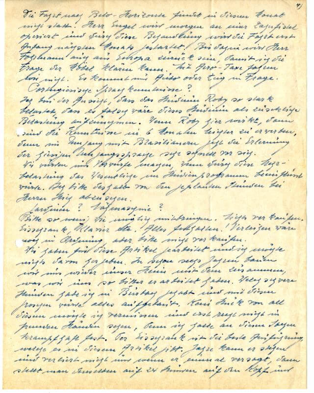 Die Fahrt nach Belo Horizonte findet in diesem Monat nicht statt. Herr Engel wird morgen an einer Zahnfistel operiert und durch diese Behandlung wird die Fahrt erst anfang nächsten Monats gestartet. Bis dahin wird Herr Fohrmann auch aus Europa zurück sein, damit ich die Frage der Möbel klären kann. Mit Aero-Taxi fahren wir nicht. Es kommt nur Auto oder Zug in Frage.
