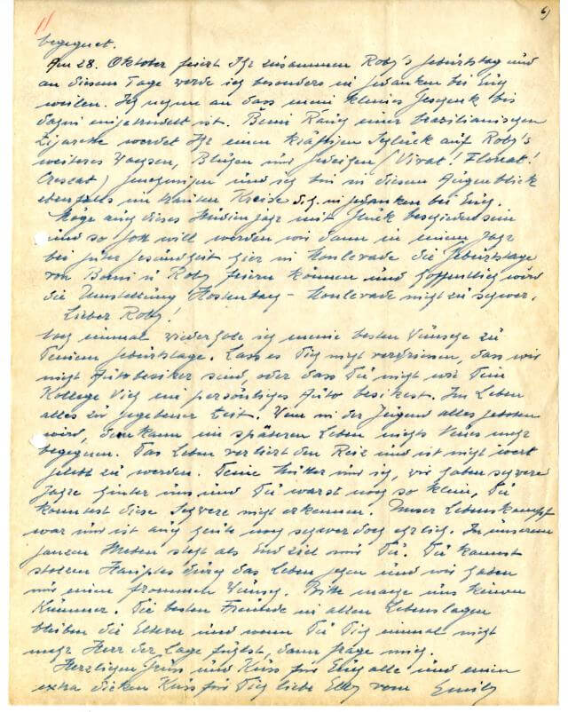 Noch einmal wiederhole ich meine besten Wünsche zu Deinem Geburtstage. Lass es Dich nicht verdriessen, dass wir nicht Autobesitzer sind, oder dass du nicht wie Dein Kollege Vich sich ein persönliches Auto besitzt. Im Leben alles zu gegebener Zeit. Wenn in der Jugend alles geboten wird, dem kann im späteren Leben nichts Neues mehr begegnen. Das Leben verliert den Reiz und ist nicht wert gelebt zu werden. Deine Mutter und ich, wir haben schwere Jahre hinter uns und Du warst noch so klein, Du konntest diese Schwere nicht erkennen. Unser Lebenskampf war und ist auch heute noch schwer doch ehrlich. In unserem ganzen Streben steht als Endziel nur Du. Du kannst stolzen Hauptes durch das Leben gehen und wir haben nur einen frommen Wunsch. Bitte mache uns keinen Kummer. Die besten Freunde in allen Lebenslagen bleiben die Eltern und wenn Du Dich einmal nicht mehr Herr der Lage fühlst, dann frage mich.