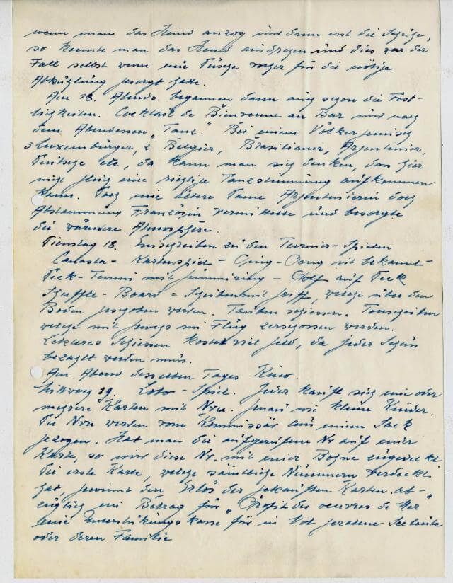 Dienstag 18. Einschreiben zu den Turnier-Spielen Canasta - Kartenspiel - Ping-Pong ist bekannt - Deck-Tennis mit Gummiring - Golf auf Deck Shuffle-Board = Schreiben mit Griff, welche über den Boden geschoben werden. Tauben schiessen. Tonscheiben welche mit Gewehr im Flug zerschossen werden. Letzteres schiessen kostet viel Geld, da jeder Schuss bezahlt werden muss.
