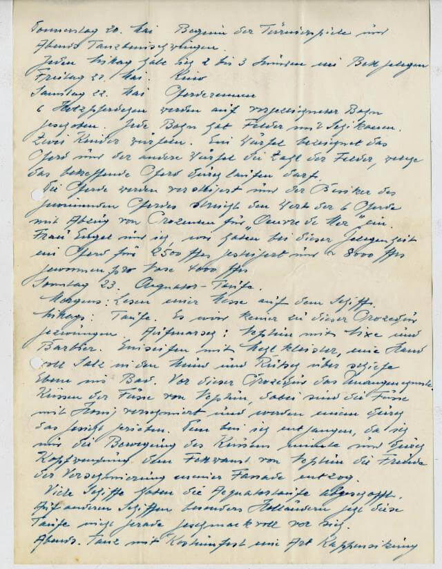 Mittags: Taufe. Es wird keiner zu dieser Prozedur gezwungen. Aufmachst: Neptun mit Nixe und Barbier. Einseifen mit Mehlkleister, eine Hand voll Salz in den Mund und Rutsch über die schiefe Ebene ins Bad. Von dieser Prozedur das unangenehmste küssende Füsse von Neptun, dabei sind die Füsse mit Honig verschmiert und werden eine durch das Gesicht gerieben. Den bin ich gut entgangen, da ich nur die Bewegung des Küssens nimmte und durch kopfwendung den Fettwanst von Neptun die Freude der verschmierung meiner Fassade entzog.
