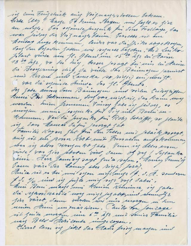 Liebe Elly! Mache dir keine Sorgen, mir fehlt das hier an nichts. Das schönste Geschenk für diese fest Lage, das war jedoch der Weihnachtsbaum. Derselbe ist am Montag angekommen, leider war die Spitze abgebrochen, doch den Schaden hatten wir schnell behoben. Mit Leukoplast wurde am hl. Abend um 15:30 Uhr zu Hause 18:30 Uhr, wobei Euch, besser gesagt bei uns zu Hause die Bescherung stieg, da wurde das Bäumchen garniert mit Kerzen und Lametta so richtig eingeweiht.