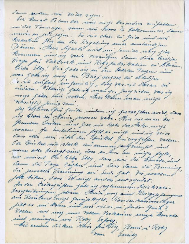 Ich schliesse für heute indem ich hervorheben will, dass ich lieber zu Hause gewesen wäre. Hier ist man bei fremden Leuten und hier ist trotz der Hitze nicht warm. an Einladungen fehlt das nicht und ich weiss dass alle mir über den Bückel hinweg helfen wollen. der Bücken ist stark zusammengeschrumpft und wenn alle besorgt sind, dass es mir an nichts fehle, so weisst Du Liebe Elly, das und und die Trennung, die gewollte Trennung ein Ende hat. Wir wollen Gott bitten, dass Er nicht anders entscheidet.