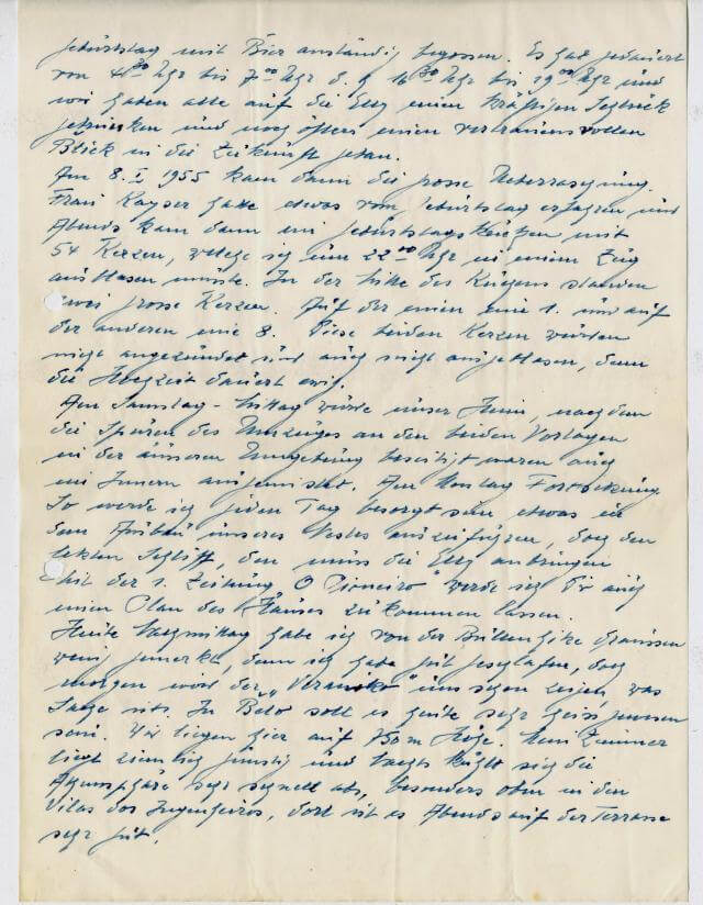 Am 8. I. 1955 kam dann die grosse Überraschung. Frau Kayser hatte etwas vom Geburtstag erfahren und abends kam dann ein Geburtstagskuchen mit 54 Kerzen, welche ich um 22 Uhr in einem Zug ausblasen musste. in der Mitte des Kuchens standen zwei grosse Kerzen. Auf der einen eine 1 und auf der anderen eine 8. Diese beiden Kerzen wurde nicht angezündet sind auch nicht ausgeblasen, denn die Hochzeit dauert ewig.