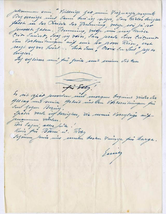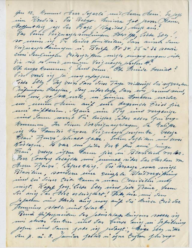 Liebe Elly! ich weiss dass diese Tage vielleicht die schwersten Prüfungen brachten, doch überlege, dass wir gesund sind, dass wir, so Gott will, in einigen Monaten wieder im neuen Heim auf eine begrenzte Frist hier neu aufbauen. Schaue um Dich und vergleiche und dann wirst du leichter über alles hinwegkommen. In diesen Vorweihnachtstagen, da kaufte ich bei Familie Kayser Weihnachtsgeschenke, welche Frau Thenwé(?) gemalt hatte. Einen Schlitten und zwei Kärtchen. Es war ein gutes Werk für eine junge Frau, welche ihren Mann hier in Brasilien verlor. Herr lud erzählte mir einmal über das Sterben von Herrn Thenwé(?). schrecklich! Die Ursache war nicht Brasilien, sondern eine simple Blutvergiftung und zu jeder Zeit kannte man Penizilin noch nicht. Kopf hoch! Liebe Elly und jede Träne, wenn sie auch das Herz erleichtert! Bitte tue mir den Gefallen und bleibe auch noch auf die kurze Zeit der Trennung stolz und stark.