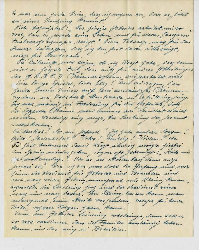 Eine lange Epistel, liebe Elly! Um zu sagen, dass heute mein Wunsch auf ein anständiges Prämiensystem im Walzwerk Monlevade in Erfüllung ging. Ich war mässig in Forderung für die Arbeiter, doch die doppelte Prämie wird immer als Resultat erzielt werden, vielleicht auch mehr, bei Senkung der Gesamtselbstkosten.
