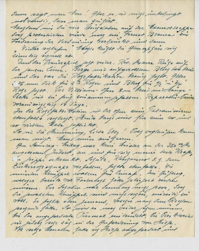 Und das Trauerspiel geht weiter. Rev. Strasse Ruhe auf der ganzen Linie. Berge mit aufgerolltem Blech 600 breit und das fast die hoch Fabrikation braucht fehlt. Alles 375(?) mm dick für 2 (?) Röhre und Blech für ½ und ¾ Rohr fehlt. Der Williams-Ofen 8m breit mit Hànge-Decke ist zu früh zusammen gefallen. Reparatur-Dauer voraussichtlich 14 Tage.