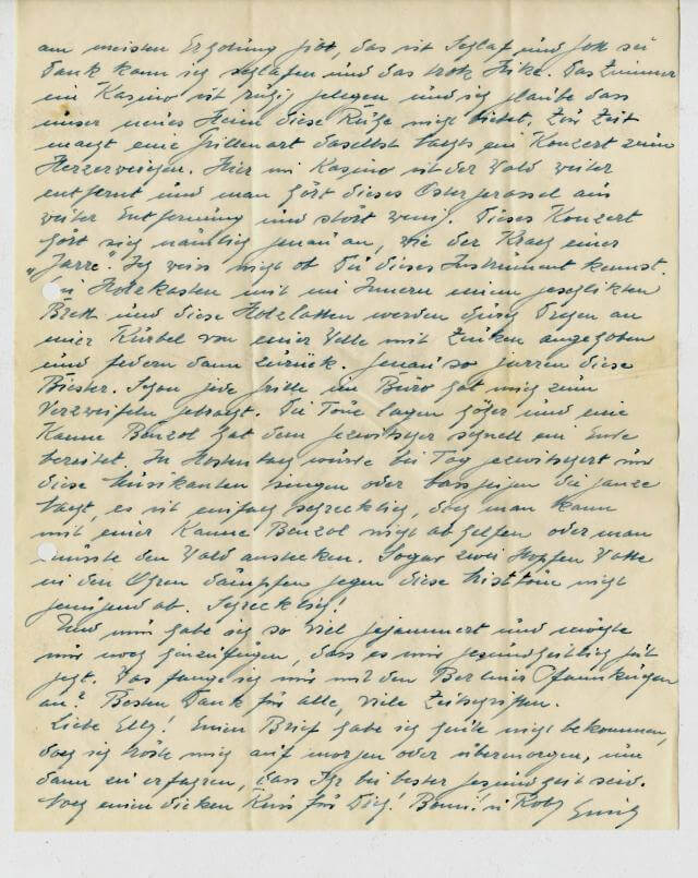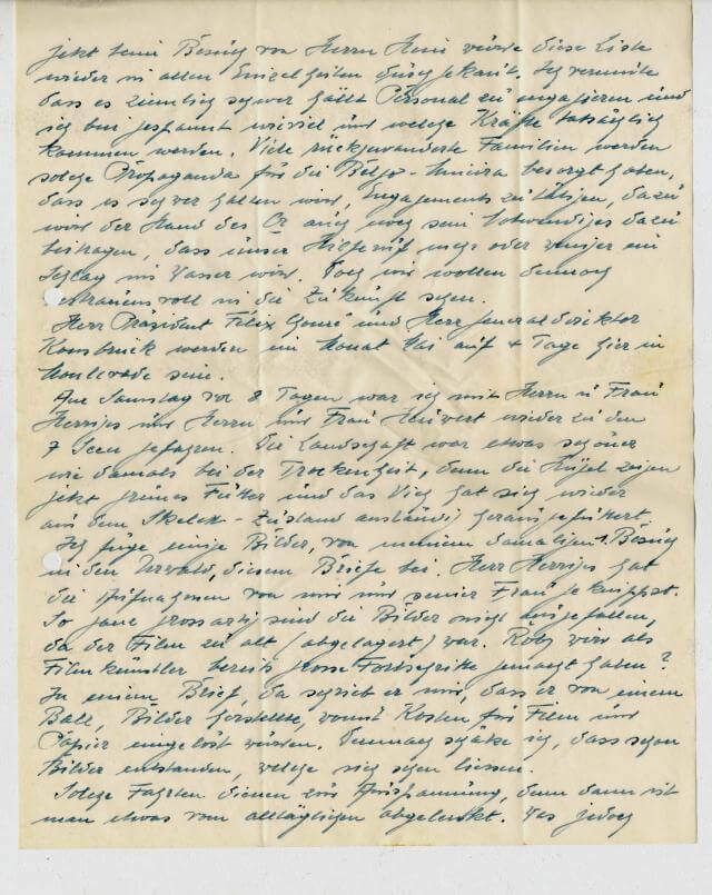 Ich füge einige Bilder, von meinem damaligen 1. Besuch in den Urwald, diesem Briefe bei. Herr Herriges hat die Aufnahme von mir und seiner Frau geknipst. So ganz grossartig sind die Bilder nicht ausgefallen, da der Film zu alt (abgelagert) war. Roby wird als Filmkünstler bereits grosse Fortschritte gemacht haben? In einem Brief, da schrieb er mir, dass er von einem Ball, Bilder herstellte, womit kosten für Film und Papier eingelöst wurden. Demnach schätze ich, das schon Bilder entstanden, welche sich sehen liessen.