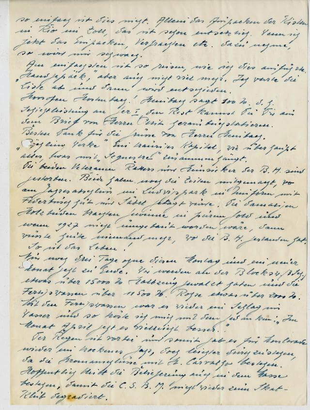 Die CSBM [Belgo Mineira] Hat Roheisen-Massel zu Bergen hier in Monlevade gestapelt und im Walde liegen für drei Jahre Holzkohlen. Da steckt das flüssige Geld, doch es ist nicht an mir zu beurteilen, ob der Karin richtig läuft, das wird Herr Präsident Felix Chomé im Mai beurteilen. (Intern).