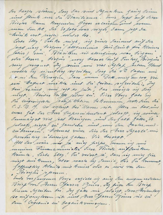 Liebe Elly! denke nicht, ich würde dauernd auf der Jagd nach “bichons” [bichos] (allgemeiner Ausdruck für kleines Getier) sein. Brasilien ist allerdings was “bichons” oder besser “bichus” [bichos] noch besser auf deutsch “Bichus” reich gesegnet. Ich gönne mir viel Schlaf. Gestern Abend wollte ich eigentlich schreiben, doch die 4(?) lagen mir so in den Knochen, dass mein Bett mich anzog, wie ein Magnet wirkte und die Zeilen schreiben: “Ich bin gesund, mir geht es gut”, das möchte ich doch nicht. Beides trifft jedoch zu. Diese Woche habe ich die zugesicherte Gratifikation bekommen, trotzdem die CSBM [Belgo Mineira] so schlecht bei Kasse ist. Alles in bar und zwar hat der Herr Superintendent gedacht, ich würde demnächst viel Geld brauchen und deshalb hätte “Er” gedacht, richtig zu handeln und mir den Zaster mitzubringen. Noch mal würde dies der Herr Scharlé mir persönlich überreicht haben. Wie besorgt!