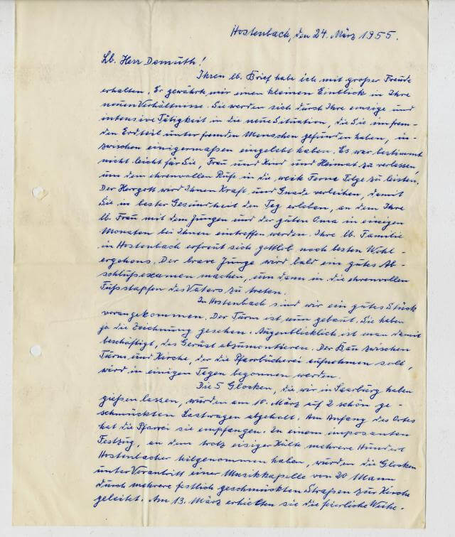 Ihren lieben Brief habe ich mit grosser Freude erhalten. Er gewährte mir einen kleinen Einblick in ihre neuen Verhältnisse. Sie werden sich durch Ihre emsige und intensive Tätigkeit in die neue Situation, die Sie im fremden Erdteil unter fremden Menschen gefunden haben, inzwischen einigermassen eingelebt haben. Es war bestimmt nicht leicht für Sie, Frau und Kind und Heimat zu verlassen, um den ehrenvollen Rufe in die weite Ferne Folge zu leisten. Der Herrgott wird Ihnen Kraft und Gnade verleihen, damit Sie in bester Gesundheit den Tag erleben, an dem Ihre Liebe Frau und dem Jungen und der guten Oma in einigen Monaten bei Ihnen eintreffen werden. Ihre liebe Familie in Hostenbach erfreut sich gottlob nach besten wohl ergeben. Der brave Junge wird bald ein gutes Abschlussexamen machen, um dann in die ehrenvolle Fussstapfen des Vaters zu treten.