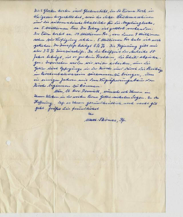 Die fünf Glocken kosten incl. Glockenstuhl, den die Firma Koch in Wadgassen hergestellt hat, sowie die elektronische Läutemaschinen und die automatische Schaltuhr für die Angelusglocke, ca. 5 Millionen Frcs. der Betrag ist gottlob vorhanden. Der Turm kostet ca 14 Millionen Frs., von denen neun Millionen schon zu Verfügung stehen. 5 Millionen Frs habe ich noch geliehen. Der Zinsfuss beträgt 6 ½ %. Die Regierung gibt mir aber 3 ½ % zinszuschuss. da die Laufzeit der Anleihe 10 Jahre beträgt, ist es gar kein Problem, die Schuld abzutragen. Inzwischen werden wir weiter arbeiten, um die Gelder durch Opfer Gänge in der Kirche und durch die Beiträge in Kirchenbauverein zusammenzubringen, um in einigen Jahren mit dem Vergrösserungsbau der Kirche beginnen zu können.