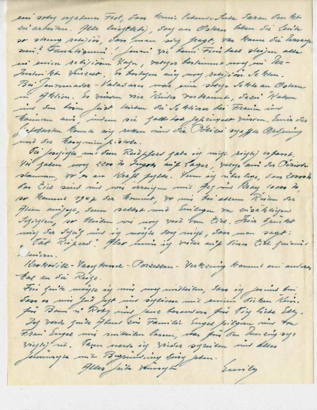 Liebe Elly! du fragst mich, wegen Herrn Briegel. Die Tochter von Herrn Briegel ist Sekretärin von Herrn lutsch und für das ganze Werk einzige wichtige Kraft sowohl für die Büros, wie auch für das Arbeitsfeld. (Betrieb). Herr Briegel leistet ebenfalls im Bürowesen große Dienste und leitet die ganze Korrespondenz. Beide sind sehr entgegenkommend und ich muss sagen, auch als Familie recht nett und entgegenkommend. Frau Briegel ist heute noch eine stolze Frau und die Familie scheint so harmonisch, dass bei Berücksichtigung von Alter und Bildung nach meiner Ansicht nur eine  Verwechslung vorliegen kann.