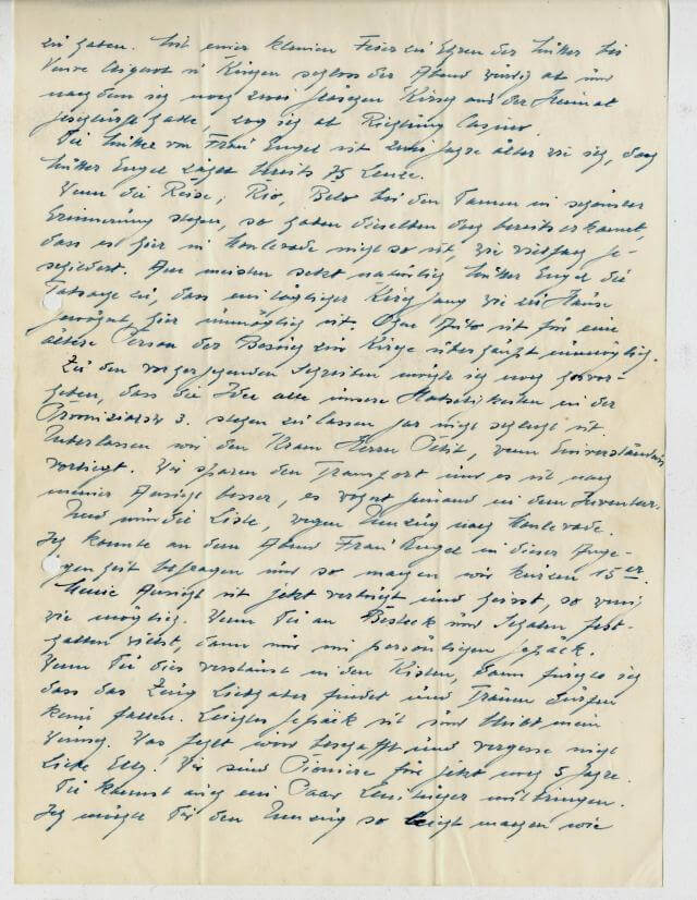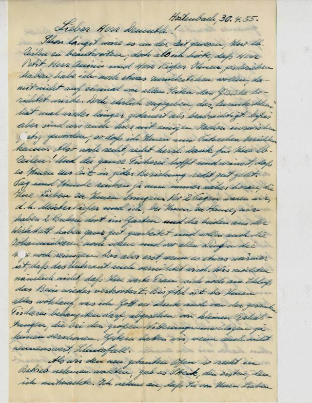 Schon längst wäre es an der Zeit gewesen, Eure lieben Zeilen zu beantworten, doch als ich hörte, dass Herr Petit, Herr Quini(?) und Herr Kiefer Ihnen geschrieben haben,Habe ich noch etwas zurückstehen wollen, damit nicht auf einmal von allen Seiten das Glück besudelt(?) wurde. Doch ehrlich zugegeben, das “Zurückstehen” hat mal wieder länger gedauert als beabsichtigt. Dafür aber sind wir auch hier mit einigen Sachen inzwischen fertig geworden, sodass ich Ihnen neue Tatsachen berichten kann. Also noch recht, recht herzlichen Dank für Ihre lieben Zeilen! Und die ganze Tischerei hofft und wünscht, dass es Ihnen zur Zeit in jeder Beziehung recht gut geht.Tag und Stunde Rücken ja nun immer näher heran, die ihre Lieben zu Ihnen bringen. Vor zwei Tagen waren wir, d.h. Meister Kiefer und ich, bei Ihnen zu Hause, wir haben zwei Buben dort im Garten und die beiden aus der Werkstatt haben ganz gut gearbeitet und sollen auch die Johannisbeeren noch setzen und vor allen die die Wege noch reinigen. Das aber erst wenn es etwas wärmer ist, dass das Unkraut auch vernichtet wird. Wir möchte nämlich nicht, dass Ihre weibe Grau sich noch am (?) das Bein wieder verkorkst. Bis jetzt ist bei ihnen alles wohlauf, was ich Gott sei Dank auch von der gesamte Fischerei behaupten darf, abgesehen von kleinen Erhaltungen, die bei den großen Witterungsumschlägen ja keinen verschonen. Gestern hatten wir, wenn auch nicht nennenswert, Schneefall.