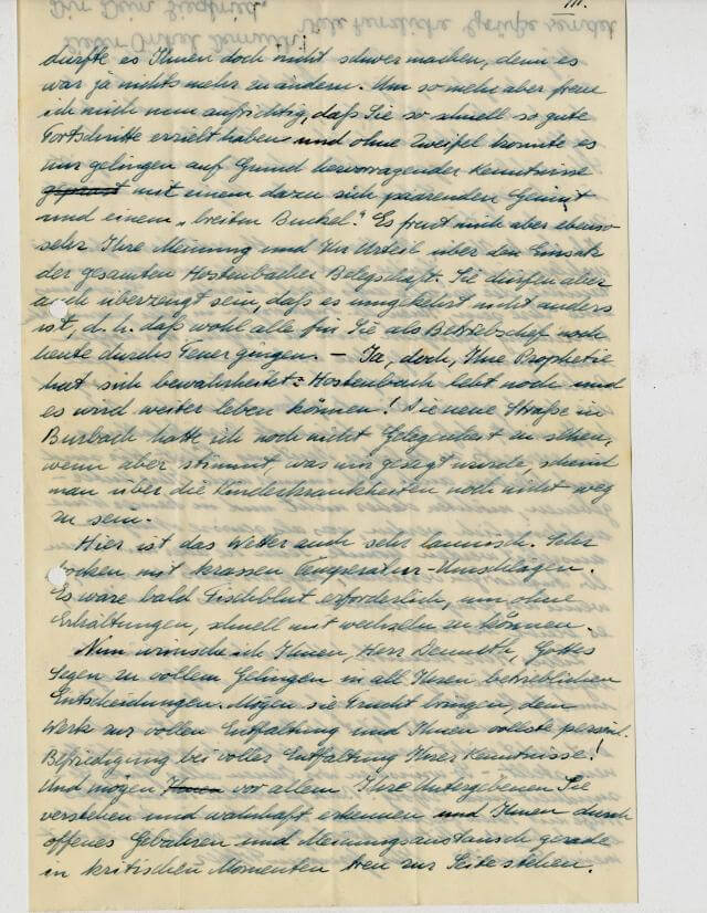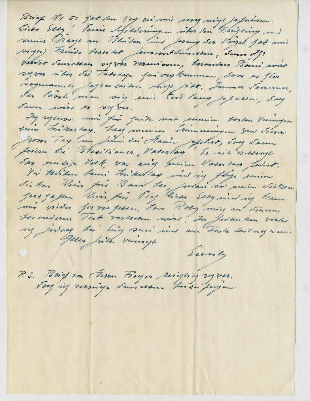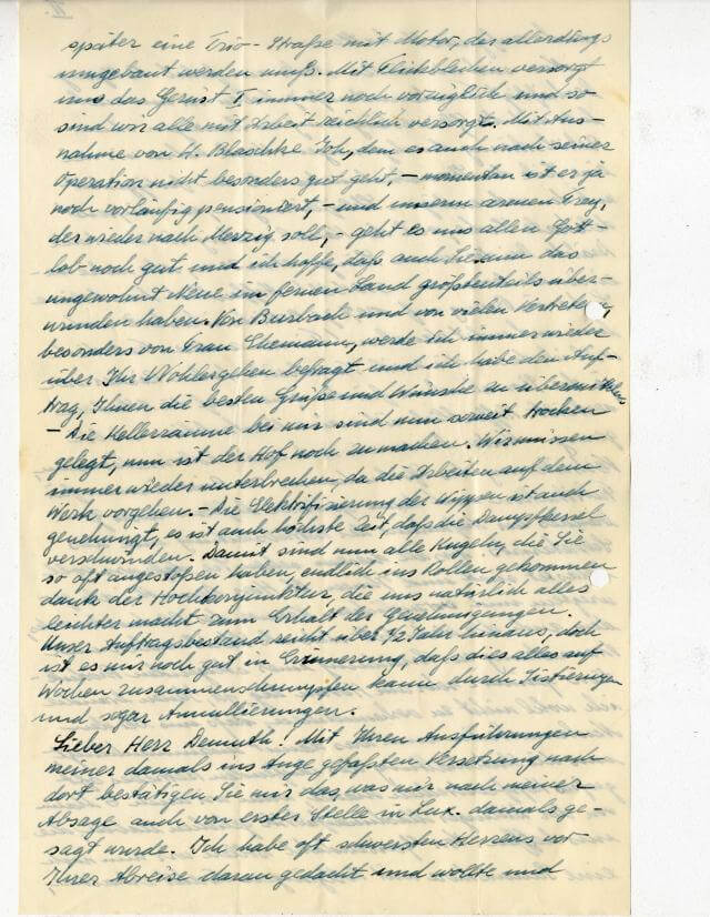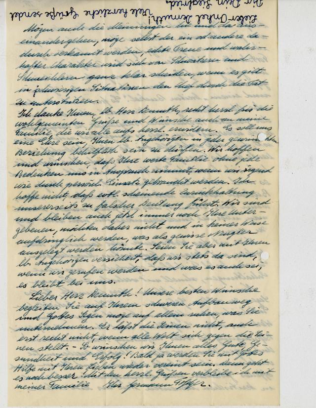 Ich danke Ihnen, lieber Herr Demuth, recht herzlich für die wohl gemeinten Grüße und Wünsche auch an meine Familie, die wir alle aufs herrliche erwidern. Es soll uns eine Ehre sein, Ihren lieben Zugehörigen in jeder gewünschten Beziehung behilflich sein zu dürfen. wir hoffen und wünschen, dass ihre Werte Familie ohne jede Bedenken uns in Anspruch nimmt, wenn wir irgendwie durch persönlichen Einsatz gebraucht werden. Ich hoffe nicht, dass eventuelle scheinende Zurückhaltung unsererseits zu falscher Deutung führt. Wir sind und bleiben auch jetzt immer noch ihre Untergebenen, möchte daher nicht und in keiner Weise aufdringlich werden, was als gewisse Neugier ausgelegt werden könnte. Seien Sie aber auf ihren lieben Angehörigen versichert, Das hier steht da sind wenn wir gerufen werden und was es auch sei, es bleibt bei uns.