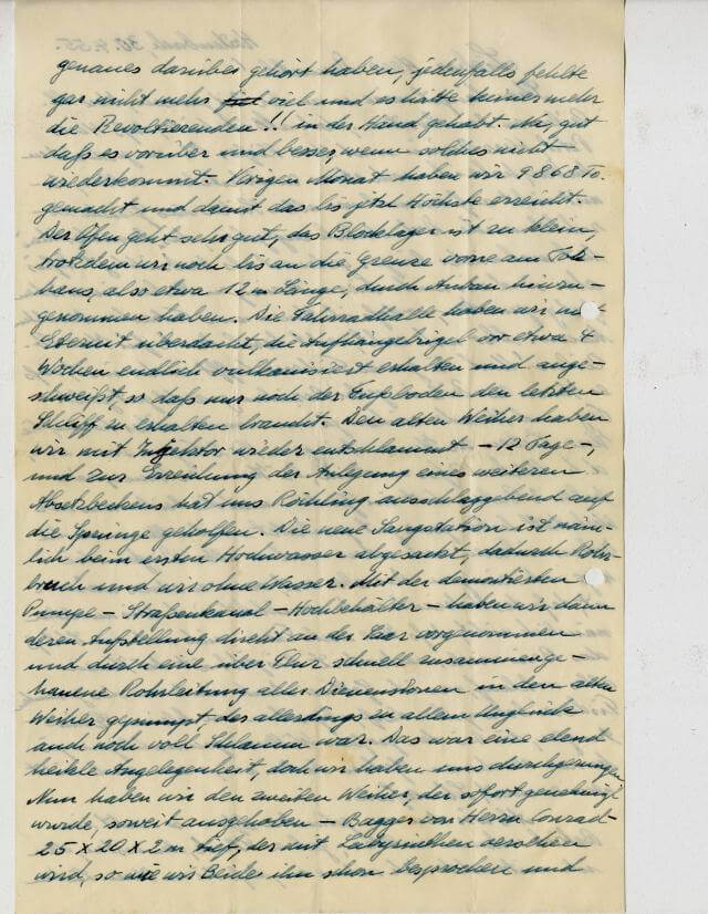 Genaues darüber gehört haben, jedenfalls fehlte gar nicht mehr viel und es hätte keiner mehr die Revoltierenden!! in der Hand gehabt. Na, gut dass es vorüber und besser, wenn solches nicht wieder kommt.Morgen Monat haben wir 9868 Tonnen gemacht und damit dass bis jetzt höchste erreicht. Der Ofen geht sehr gut, das Blocklager ist zu klein, trotzdem wir noch bis an die Grenze vorne am Torhaus, also etwa 12 m Länge, durch Anbau hinzugenommen haben. Talerradhalle haben wir mit Evernote überdacht, Die Aufhängebügel von etwa vier Wochen endlich vulkanisiert erhalten und angeschweißt, so dass nur noch der Fußboden den letzten Schliff zu erhalten braucht. Den alten Weiher haben wir mit Injektor wieder entschlammt - 12 Tage –,und zur Heizung der Anlegung eines weiteren Absetzbecken hat uns Röchling ausschlaggebend auf die Sprünge geholfen. Die neue lang Station ist nämlich beim ersten Hochwasser abgesagt, da Durchbruch und wir ohne Wasser. Mit einer demontierten Pumpe - Straßenkanal – Hochbehälter – haben wir dann deren Aufstellung direkt an der saar vorgenommen und durch eine über Flur schnell zusammen gehauen Rohrleitung aller Dienenschorren in den alten Weiher gepumpt, der allerdings zu allem Unglück auch noch voll Schlauen war. Das war eine Elend heikle Angelegenheit, doch wir haben uns durchgesungen. Nun haben wir den zweiten Weiher, der sofort genehmigt wurde, soweit ausgehoben –  Bagger von Herrn Conrad - 25 x 20 x 2m tief, der mit Labegedie(?) versehen wird, so wie wir Beide ihn schon besprochen und