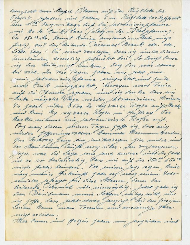 Liebe Elly! du wirst verstehen, dass ich unter diesen Umständen ziemlich gedrückt bin. So leicht lasse ich den Mut nicht sinken, doch dies war etwas zu viel. In vier Tagen haben wir jetzt eine neue Galvanisierpfanne eingesetzt und heute wird Zink umgepackt, morgen wird Feuer auf die Pfanne gegeben und ich denke dass wir Mitte nächster Woche wieder galvanisieren können. Wir haben über 2.500 To schwarze Rohre auf Stock und kein Kilogramm schwarze Rohre in Auftrag. Der Markt nimmt nur galvanisierte Rohre auf. Doch nach diesen miesen Tagen hoffe ich, dass auch wieder hoffnungsvolle Momente kommen werden. Am Mittwoch ging ein Gewitterregen hier nieder und der Staudamm läuft noch über. Im vergangenen Jahre war die Lage eine ganz andere und deshalb ist es so bedauerlich, dass wir auf der 350er -650er nichts fertig bringen. Vor einem Jahr schon. Kurz nach meiner Ankunft habe ich nach einem Walzmeister gefragt für diese Straßen, denn das leitende Personal ist unmöglich. jetzt habe ich den Präsidenten meine Sorgen mitgeteilt, und ich hoffe, dass jetzt etwas geschieht. Mit den hierigen Leuten kann man Tonnen und anständige Ware nicht erzielen.
