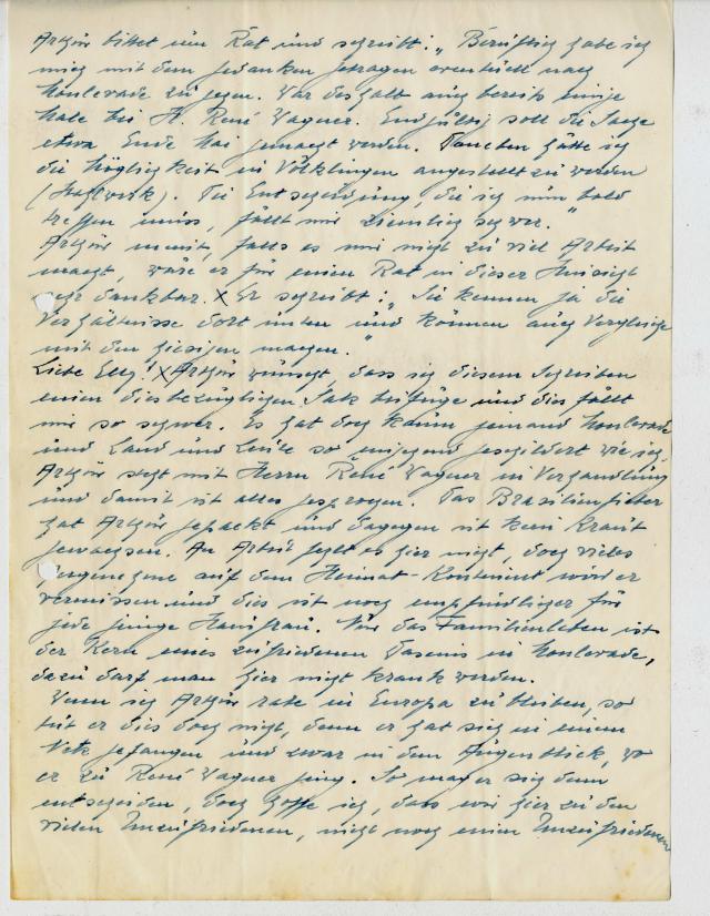 Liebe Elly! *Arthur wünscht, dass ich diesem Schreiben einen diesbezüglichen Satz bei füge und dies fällt mir so schwer. Es hat doch kaum jemand Monlevade und Land und Leute so eingehend geschildert wie ich. Arthur steht mit Herrn René Wagner in Verhandlung und damit ist alles gesprochen. Das Brasilienfieber hat Arthur gepackt und dagegen ist kein Kraut gewachsen Punkt an Arbeit fehlt es hier nicht, doch vieles Angenehme auf dem Heimat-Kontinent wird er vermissen und dies ist noch empfindlicher für jede junge Hausfrau. Nur das Familienleben ist der Kern eines zufriedenen Daseins in Monlevade, dazu darf man hier nicht krank werden.