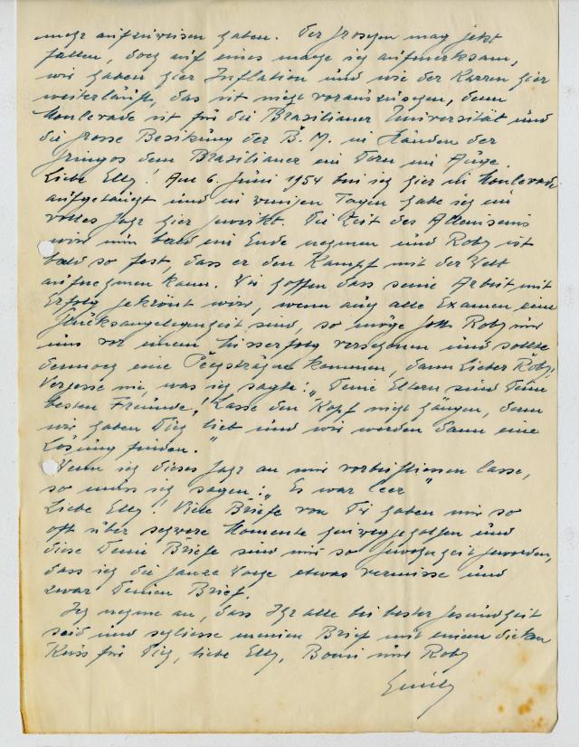 Liebe Elly! Am 6. Juni 1954 bin ich hier in Monlevade aufgetaucht und in wenigen Tagen habe ich ein volles Jahr hier gewirkt. Die Zeit des Alleinseins wird nun bald ein Ende nehmen und Roby ist bald so fest, dass er den Kampf mit der Welt aufnehmen kann. Wir hoffen dass deine Arbeit mit Erfolg gekrönt wird, wenn auch alle Examen eine Glücksangelegenheit sind, so möge Gott Roby und uns vor einem Misserfolg verschonen und sollte dennoch eine Pechsträhne kommen, dann lieber Roby, vergesse nie, was ich sagte: “Deine Eltern sind deine besten Freunde! Lasse den Kopf nicht hängen, denn wir haben Dich lieb und wir werden dann eine Lösung finden.”