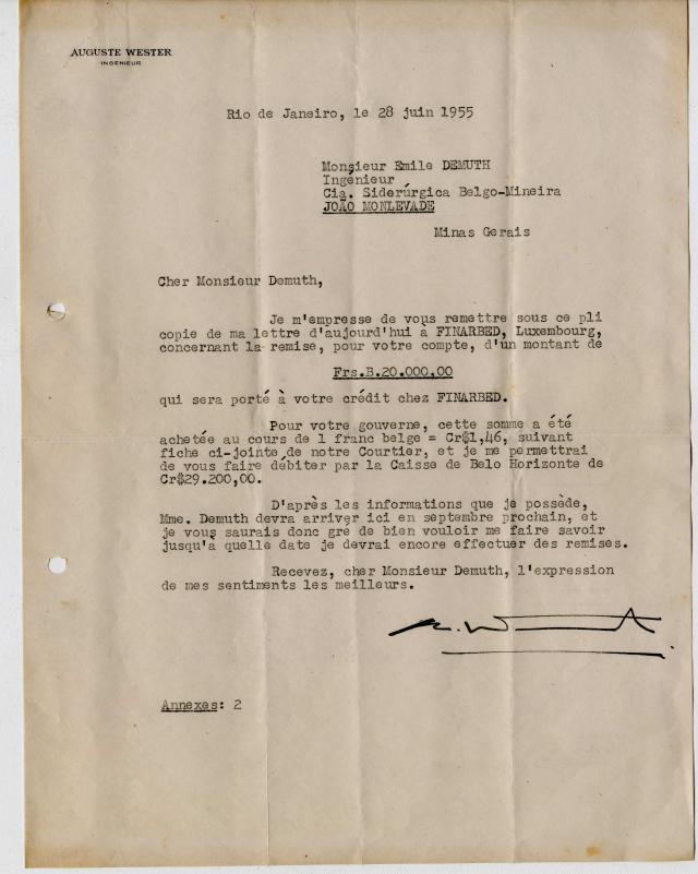 Pour votre gouverne, cette somme a été achetée au cours de 1 franc belge = Cr$ 1,46, suivant fiche ci-jointe de notre Courtier, et je me permettrai de vous faire débuter par la caisse de Belo Horizonte de Cr$ 29.200,00.